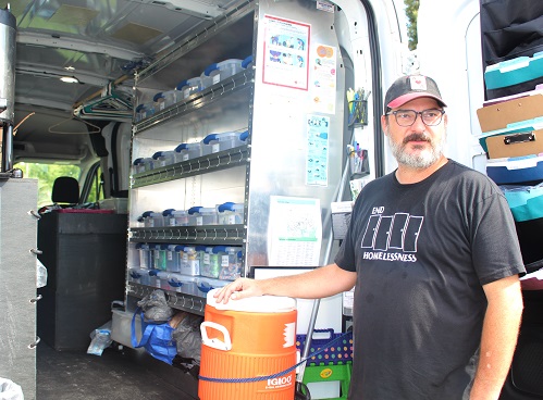 Watson starts his weeks by taking inventory of the organization’s outreach van. He ensures it is stocked with supplies like mouthwash, socks and bag lunches — items that many take for granted but are critical to individuals who are experiencing homelessness. Then he drives through town to pass out these supplies and build relationships with people.
